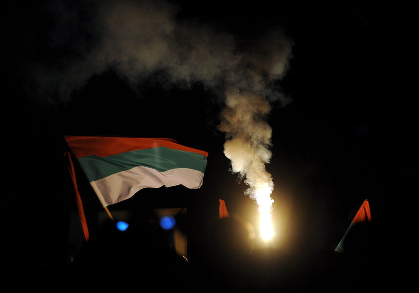 Някои от българските флагове бяха обърнати - символ на военно положение. Снимката е от петъчните протести.